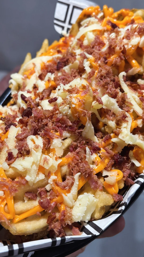 Nossa icônica batata em formato de rede, ultra crocante, coberta com um mix cremoso de queijo Cheddar e Mussarela, finalizada com cubos crocantes de bacon.