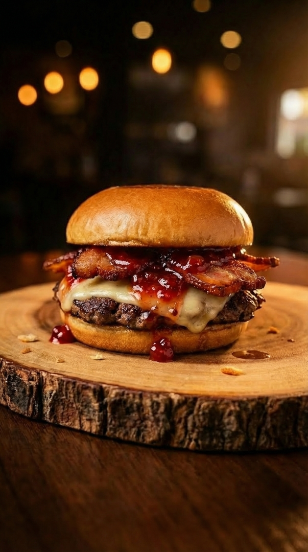 Pão Brioche, Blend 120g Angus, Queijo Provolone Defumado, Bacon Crocante e Ketchup Goibada Artesanal.